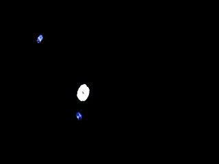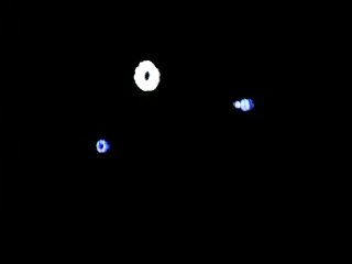 The large white circle is the sun, while the two smaller circles are the ships. The photo to the left shows the "black" ship to the lower left, and the "white" ship to the right. The "white" ship is firing its engines, accelerating away from the sun. The photo to the right is less distinct, but the "white" ship is at the upper left and the "black" ship is towards the bottom.